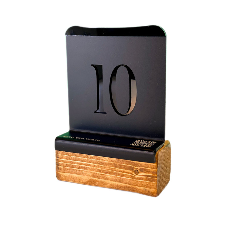 این استند شماره میز رستورانی از چوب طبیعی نراد ساخته شده که با رنگ گیاهی و سازگار با محیط زیست پرداخت شده است. تلفیق با پلکسیگلاس مشکی مات و براق جلوهای لوکس و در عین حال مینیمال به این محصول بخشیده است؛ مناسب برای فضاهای خاص، کافههای مینیمال، رستورانهای کلاسیک و کافیشاپهای مدرن.